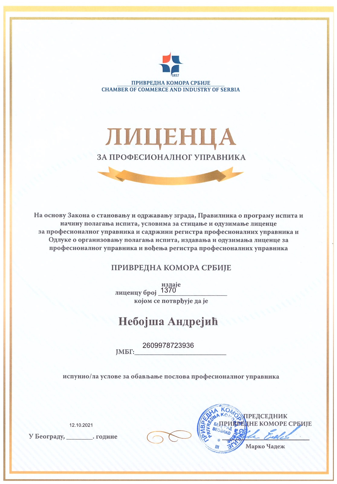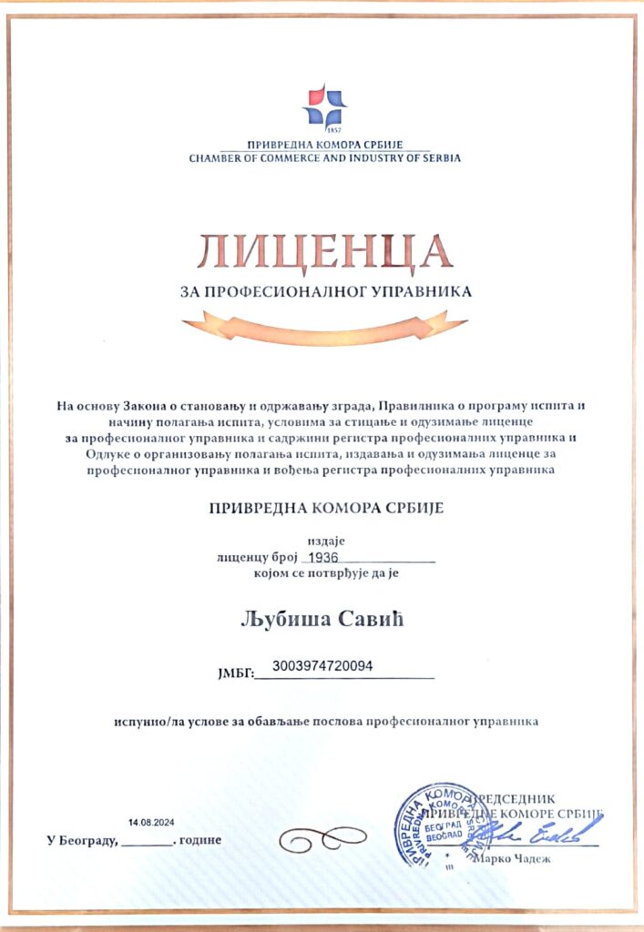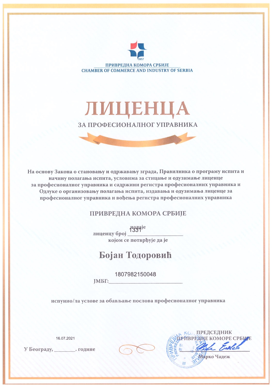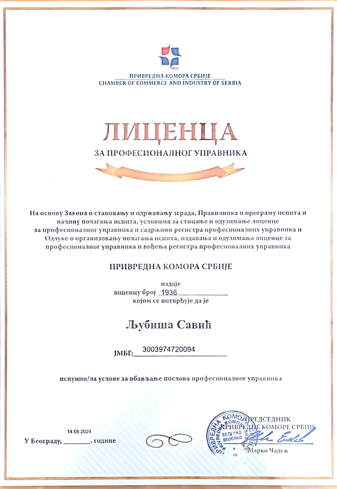 Licenca za upravljanje zgradama nam nije bila neophodna da unapredimo naše životno okruženje ali jeste da bi shvatili širi okvir i propise koji nam olakšavaju upravljanje kao i zakonska ograničenja sa kojima moramo da se nosimo. Stekli smo licencu za upravljanje, osnovali firmu i spremni smo da preuzmemo upravljanje i u Vašoj stambenoj zajednici.